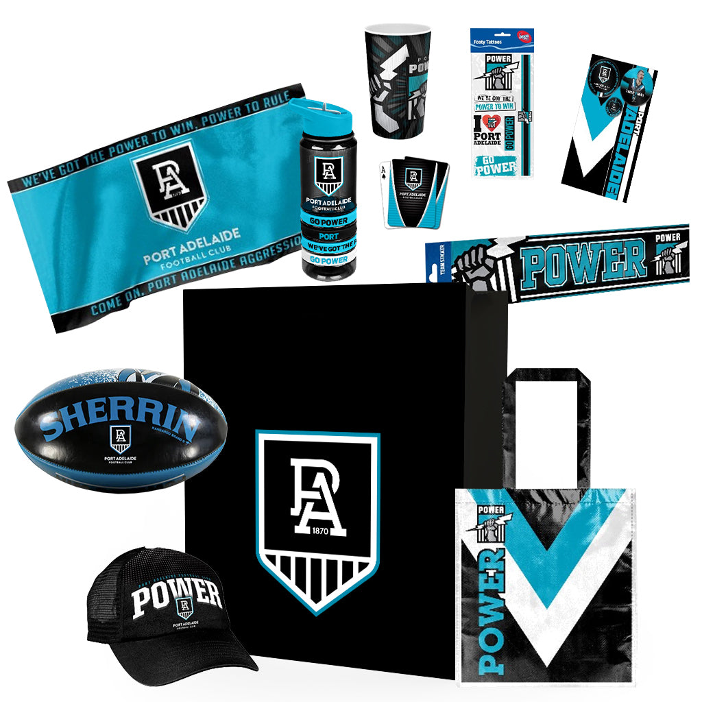 1x Port Adelaide Laminated Bag 1x Port Adelaide Soft Touch Football 1x Port Adelaide Trucker Cap 1x Port Adelaide Lenticular Tumbler 1x Port Adelaide Badge Card 1x Port Adelaide Playing Card 1x Port Adelaide Mini Flag 1x Port Adelaide Bottle 1x Port Adelaide Bumper Sticker 1x Port Adelaide Tattoo Sheet